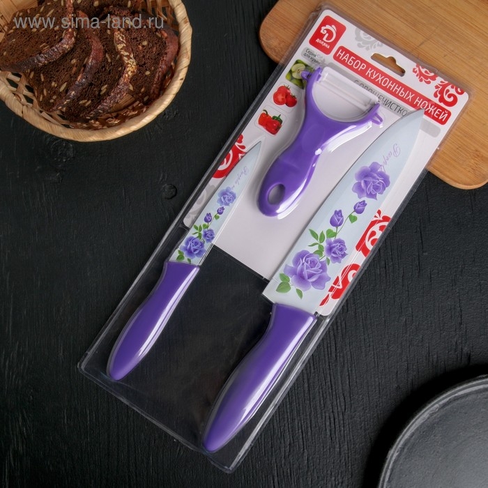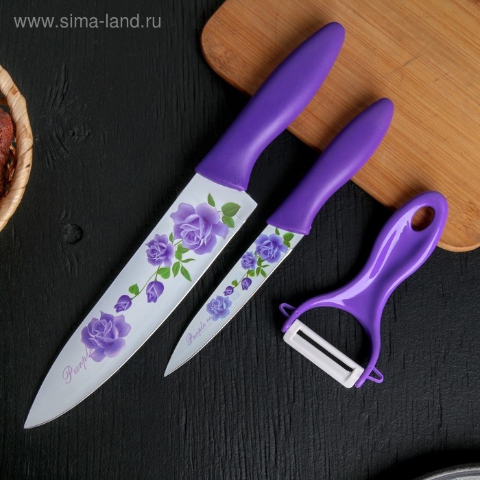 Набор кухонных принадлежностей Доляна «Нарцисс», 3 предмета: 2 ножа с антиналипающим покрытием, лезвие 12 см, овощечистка, 20×4 см, цвет фиолетовый