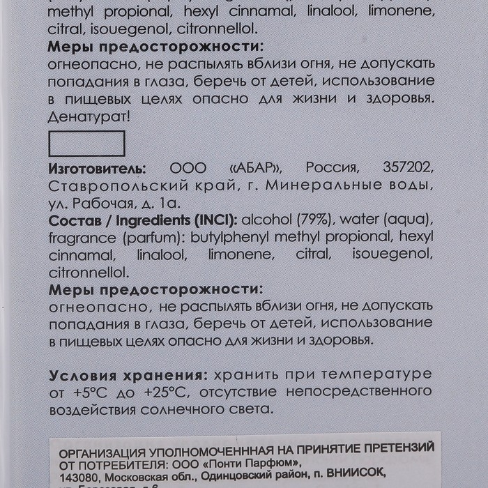 Состав: денатурированный спирт 80%, парфюмерная композиция 10%, вода 10%.