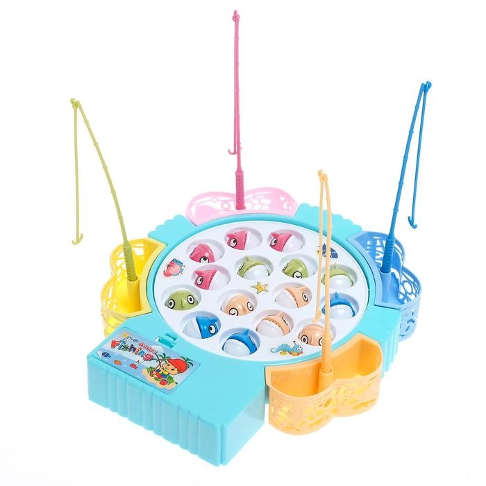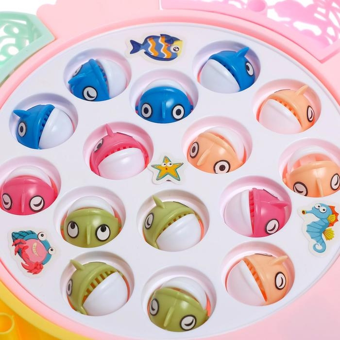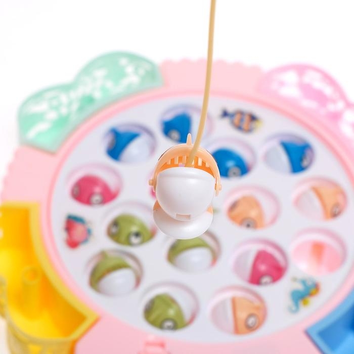 Чтобы начать, нужно включить платформу с рыбками: Игрушки начнут вращаться, и кроха сможет вылавливать их с помощью удочки. Весь процесс сопровождается задорной музыкой, с которой рыбачить ещё увлекательнее.