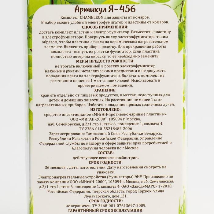Меры предосторожности: не трогать включенный в розетку электрофумигатор влажными руками, металлическими предметами и не допускать попадания влаги на электрофумигатор.