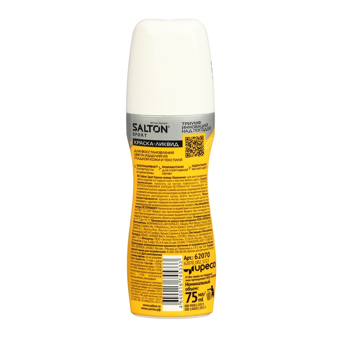 Белая краска-ликвид от Salton Sport закрасит потёртости и царапины на вашей обуви. Нажимаем на флакон, аккуратная маленькая губка точечно и быстро распределяет краску по необходимому участку обуви. Подошва кроссовок теперь идеально белая, а царапины заполнились краской. Благодаря размеру спонжика можно удобно пользоваться средством для белой обуви с цветными вставками. Превосходство и контроль над ситуацией. А ещё универсальность. Ведь белая краска для обуви от Salton Sport подходит не только для изделий из кожи и текстиля, но может применяться для восстановления новизны аксессуаров белого цвета. Носите не просто белую, а идеально белую обувь благодаря Salton Sport.