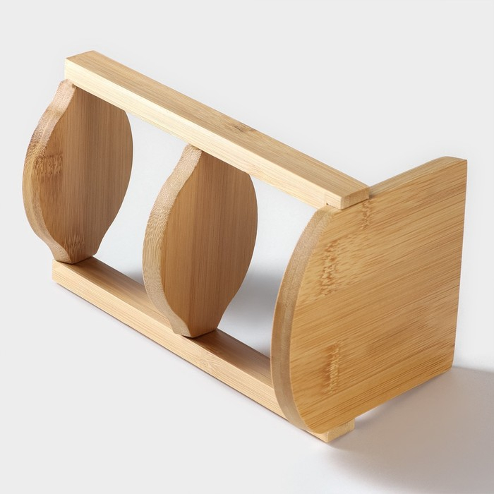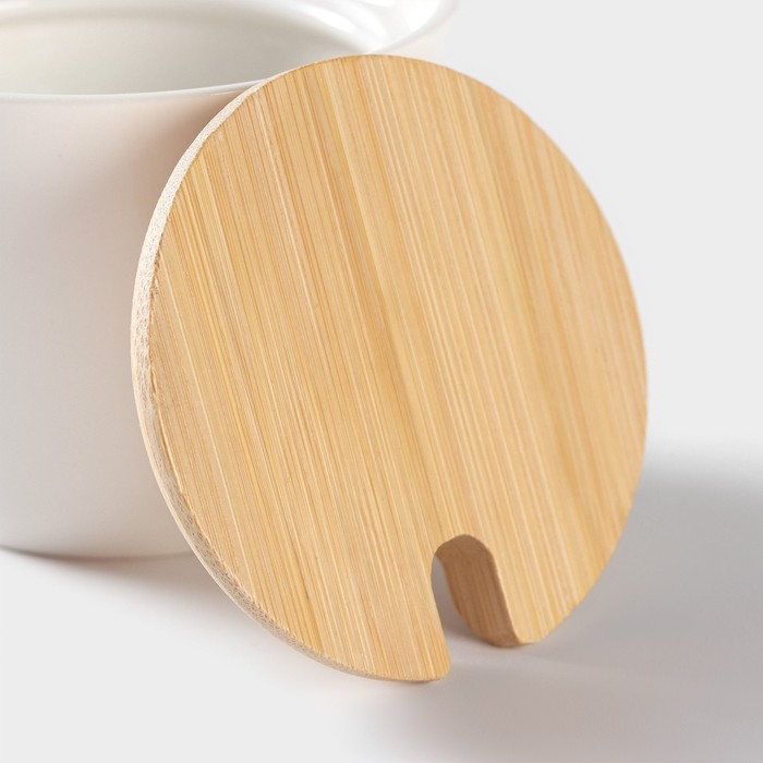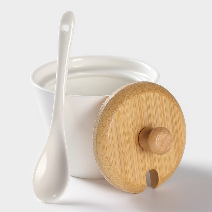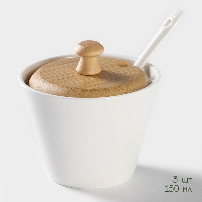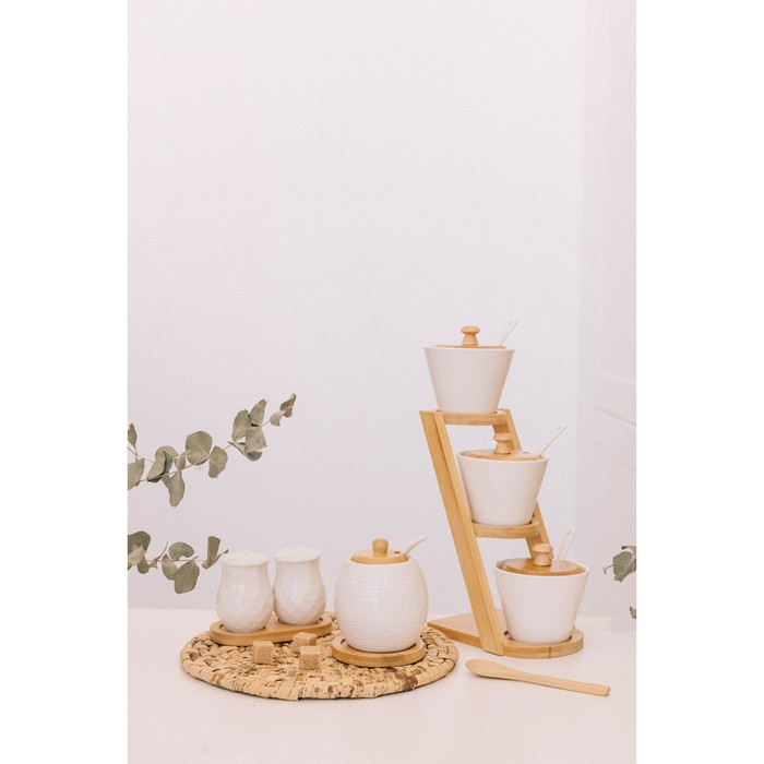 Банки для хранения сыпучих продуктов с ложками на бамбуковой подставке BellaTenero, 7 предметов: 3 банки 150 мл, 3 ложки, фарфоровая, цвет белый