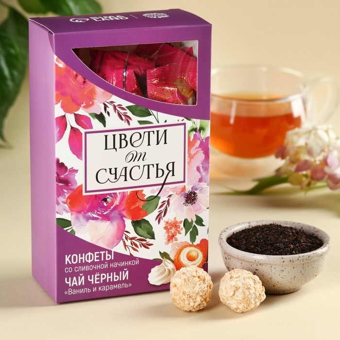Подарочный набор «Цвети от счастья»: чай чёрный со вкусом ваниль и карамель 50 г., конфеты со сливочной начинкой 150 г.