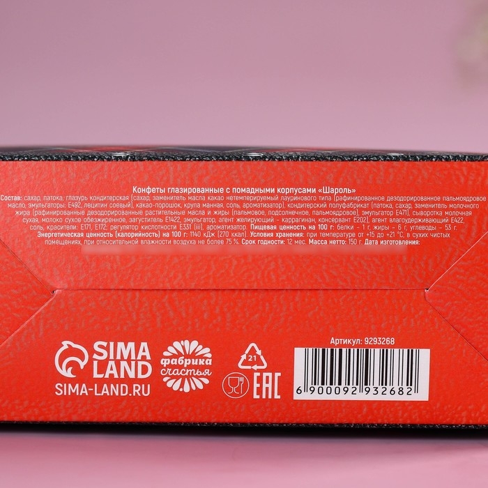Состав: сахар, патока, глазурь кондитерская (сахар, заменитель масла какао нетемперируемый лауринового типа (рафинированное дезодорированное пальмоядровое масло, эмульгаторы: Е492, лецитин соевый), какао-порошок, крупа манная, соль, ароматизатор), кондитерский полуфабрикат (патока, сахар, заменитель молочного жира (рафинированные дезодорированные растительные масла и жиры (пальмовое, подсолнечное, пальмоядровое), эмульгатор Е471), сыворотка молочная сухая, молоко сухое обезжиренное, загуститель Е1422, эмульгатор, агент желирующий – каррагинан, консервант Е202), агент влагоудерживающий Е422, соль, красители: Е171, Е172; регулятор кислотности Е331 (iii), ароматизатор.