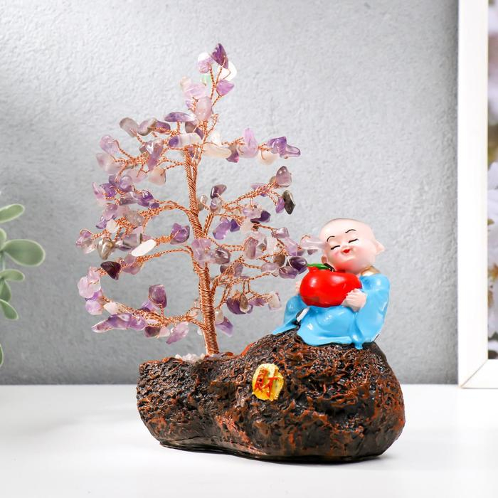 Сувенир бонсай 147 камней "Хотей с яблоком у дерева с аметистами" 18х13х6 см