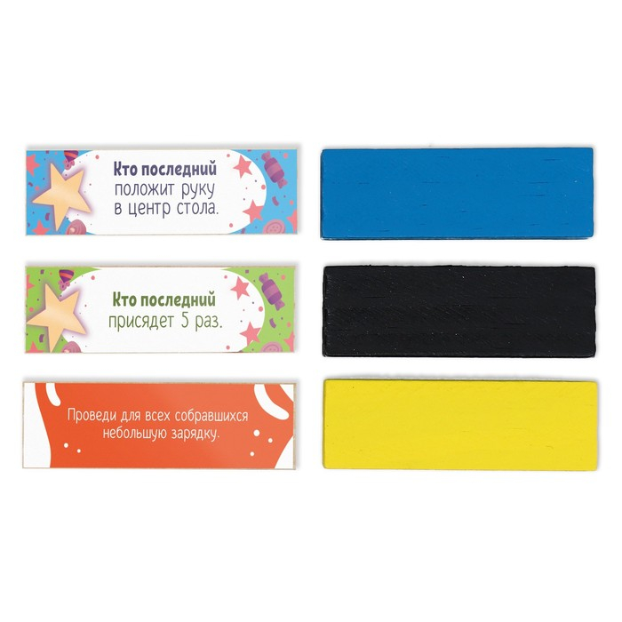 Внимание! В игре есть обычные задания-фанты, а есть задания на скорость. Они отмечены звёздочкой. Тот, кто читает задание, в игре не участвует. Задача остальных — быстрее всех выполнить задание. Кто справился последним, в свой ход вытягивает не один, а два бруска.