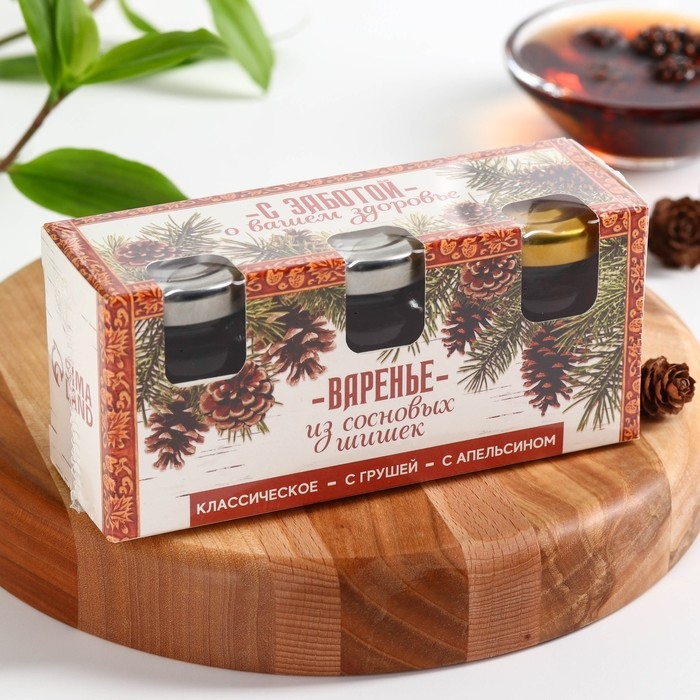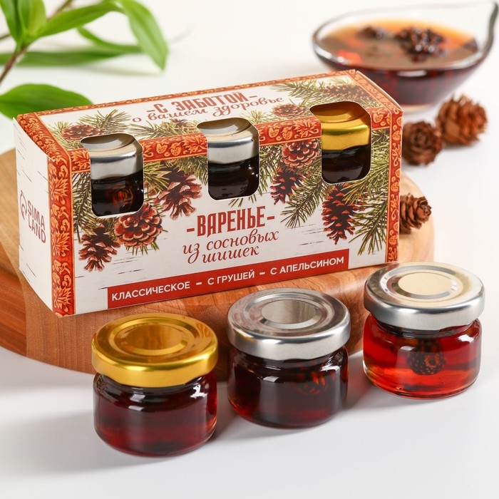 Набор варенья с сосновыми шишками «С заботой о здоровье»: классическое, с грушей, с апельсином, 90 г (3 шт. х 30 г).