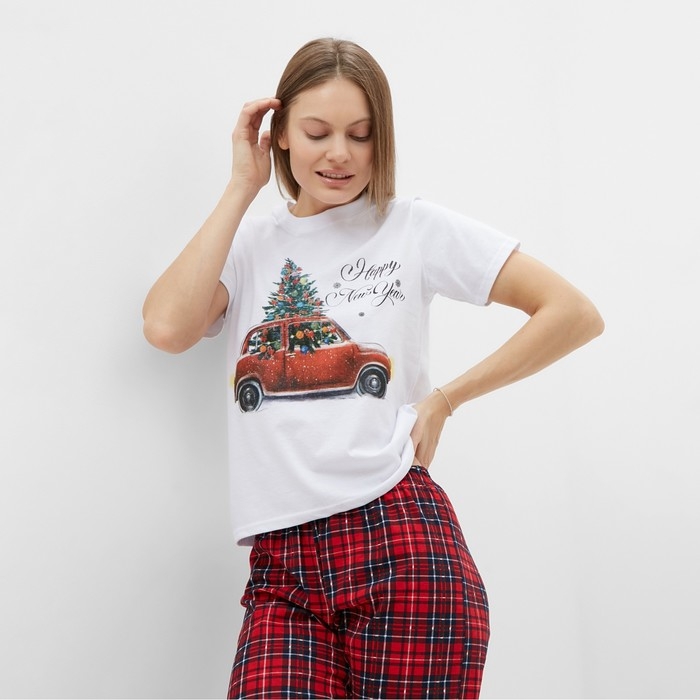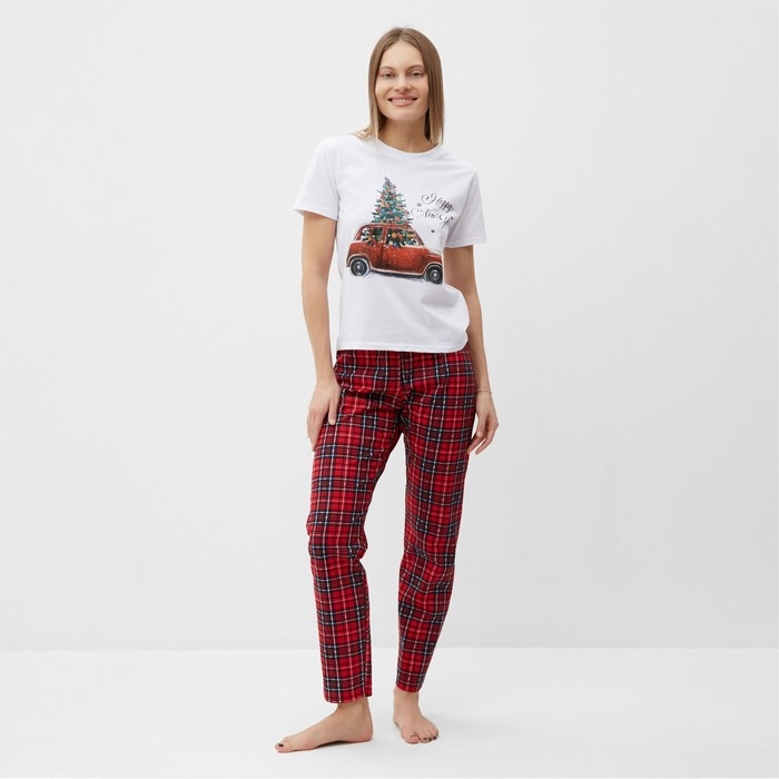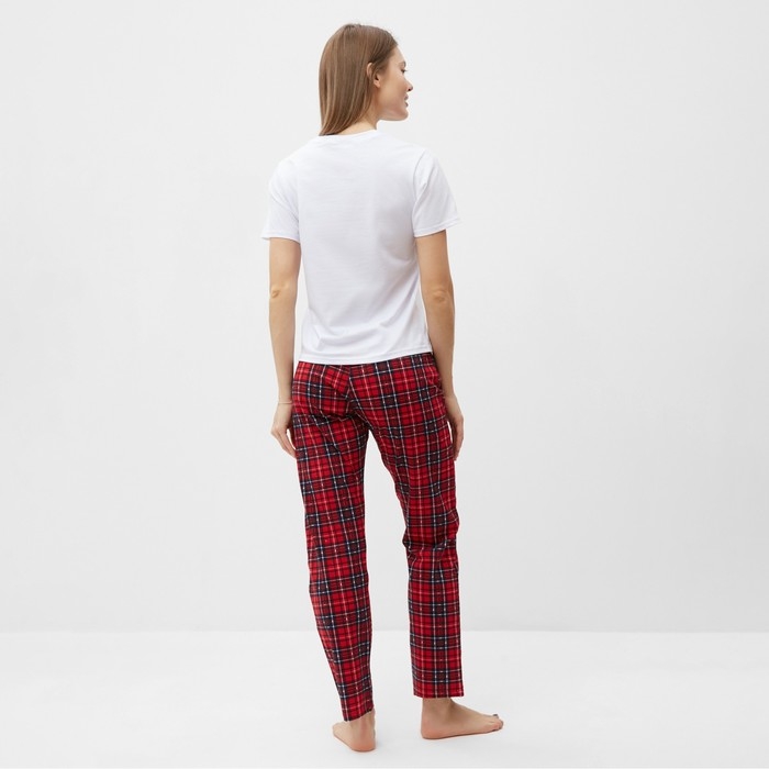Комплект (футболка,брюки) домашний женский, цвет белый/красная клетка, размер