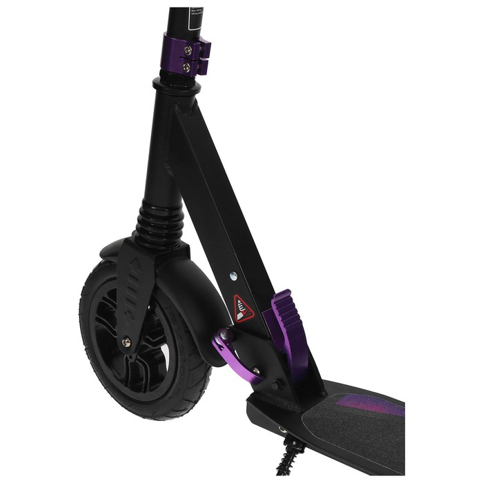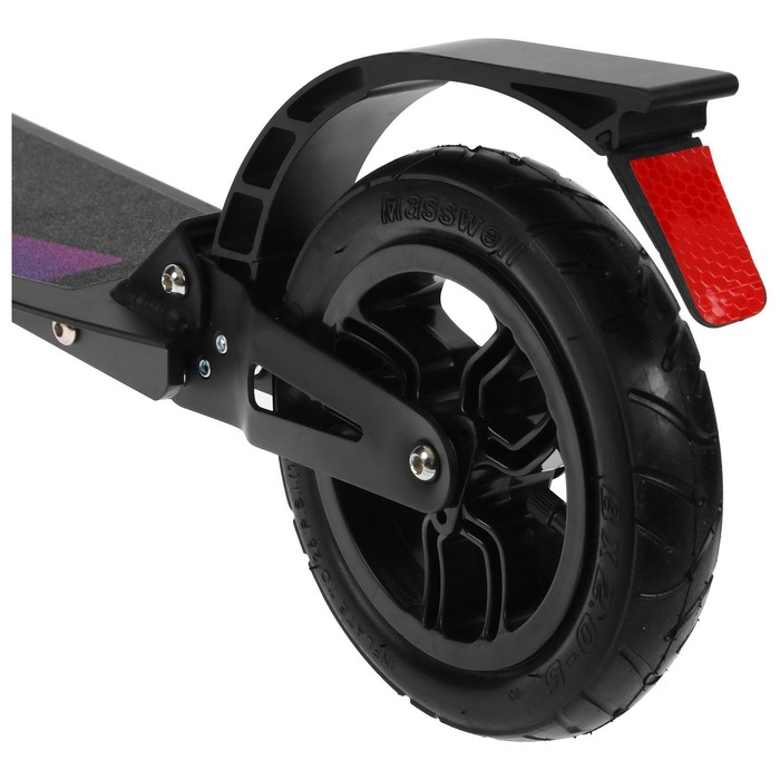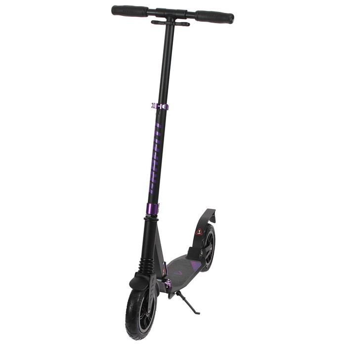 Самокат оснащён складным механизмом, благодаря которому транспорт комфортно хранить и транспортировать. Амортизатор смягчает движения по неровностям. Надувные резиновые колёса производят минимум шума при движении.