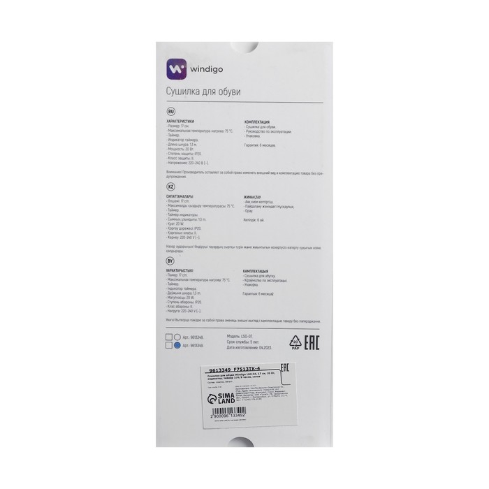 Сушилка для обуви Windigo LSO-07, 17 см, 20 Вт, индикатор, таймер 3/6/9 часов, белая