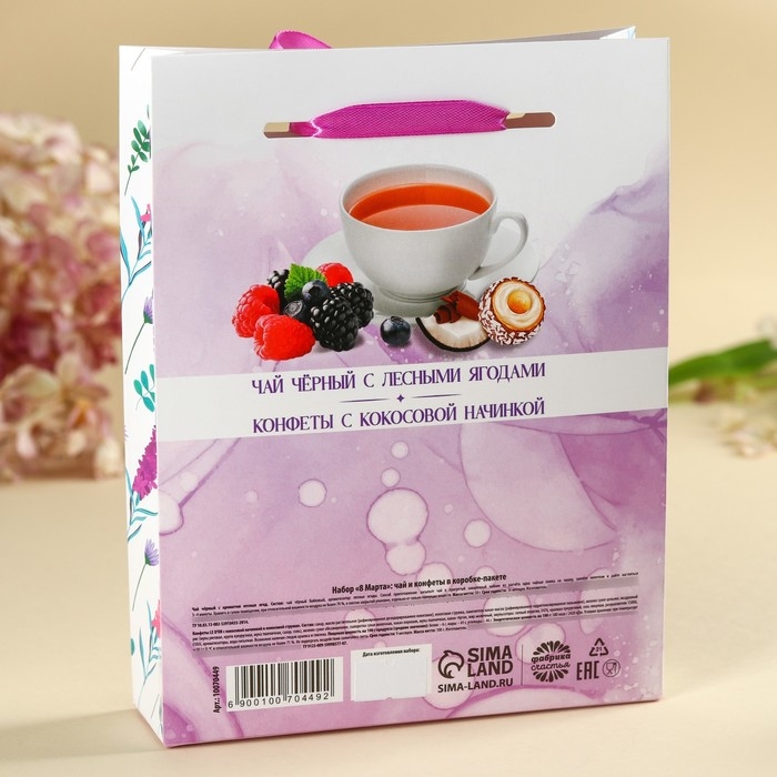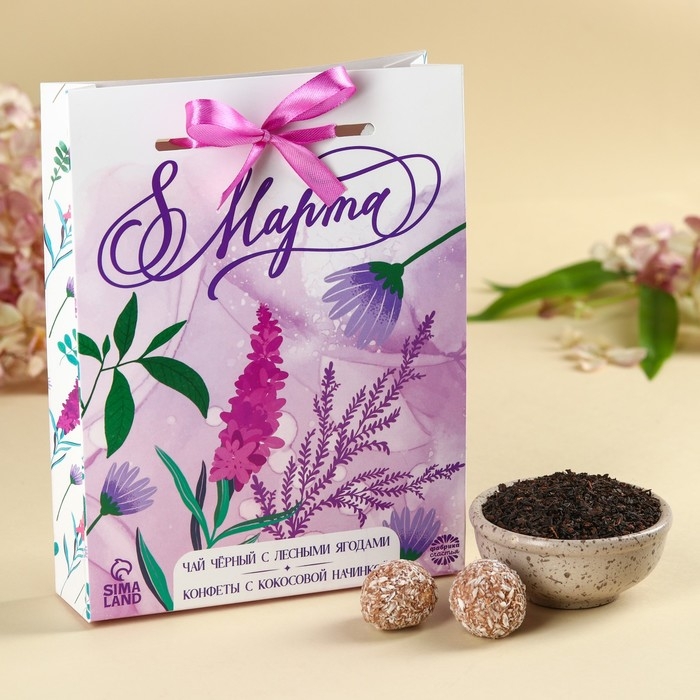 Набор «8 марта»: чай чёрный с лесными ягодами 50 г., шоколадные конфеты 100 г.