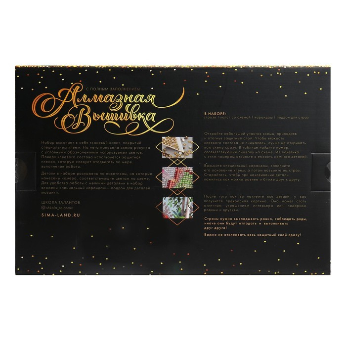 Тканевая основа имеет исключительное клеевое покрытие, которое надёжно удерживает кристаллики. С помощью пинцета вам нужно разложить их по нарисованной схеме с обозначением необходимых цветов, полностью заполнив полотно. Отдельно вас порадует то, что все цвета схемы расположены рядом с рабочей областью холста. А это значит, что схема всегда будет под рукой!