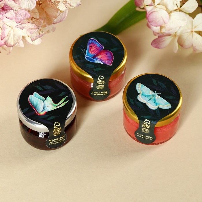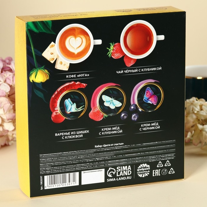 Набор «Цвети от счастья»: чай чёрный со вкусом клубники 50 г., кофе со вкусом нуги 50 г., варенье из сосновых шишек с клюквой 30 г., крем-мёд с клбуникой, 30 г., крем-мёд с черникой 30 г.