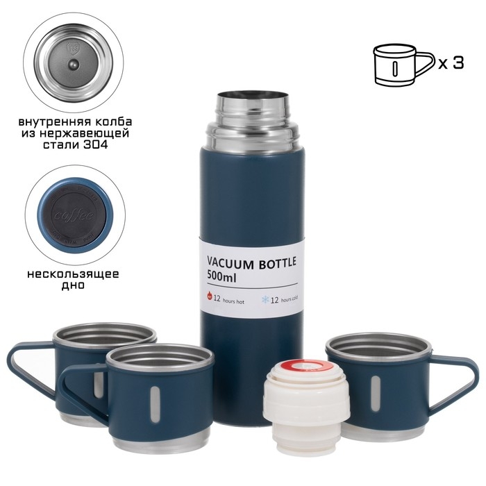 Набор "Мастер К": термос 500 мл и 3 кружки 160 мл, сохраняет тепло 12 ч, синий