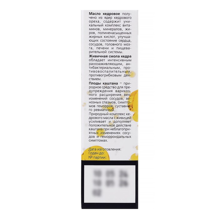 Состав: масло кедровое – 50%, живица кедровая – 30%, плоды каштана – 10%, семена каштана – 10%.