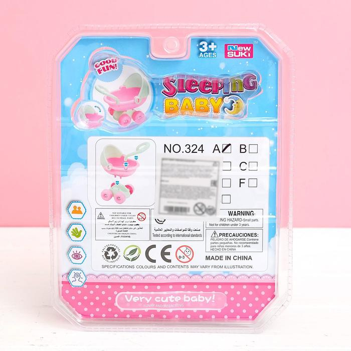 В комплекте есть бутылочка и коляска. У коляски крутятся колёса. Все игрушки сделаны из пластика.