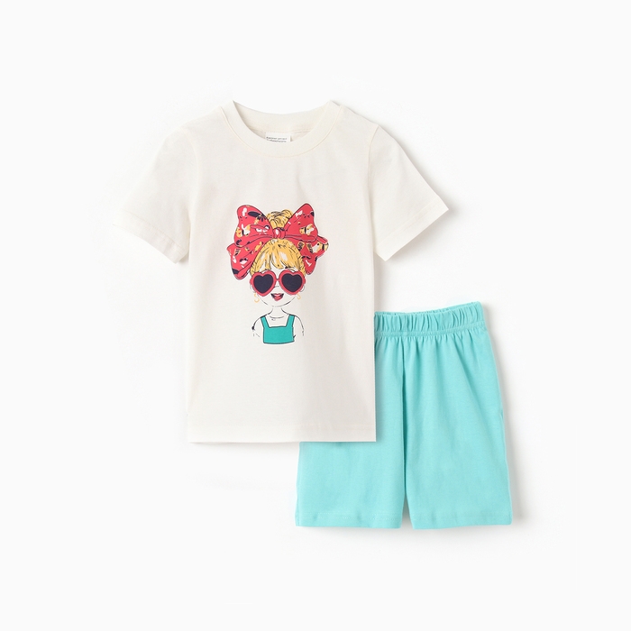 Комплект для девочки "Девочка" (футболка/шорты), цвет молочный/бирюзовый, рост 128-134 см