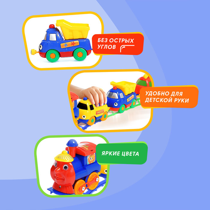 - В комплект входит 1 локомотив и 3 разных вагончика.