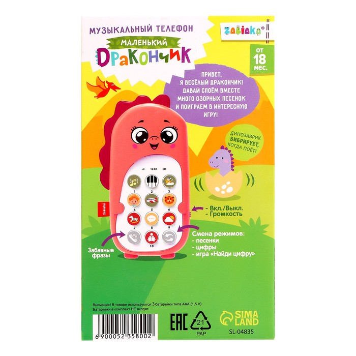 Музыкальный телефон «Маленький дракончик», звук, цвет фиолетовый