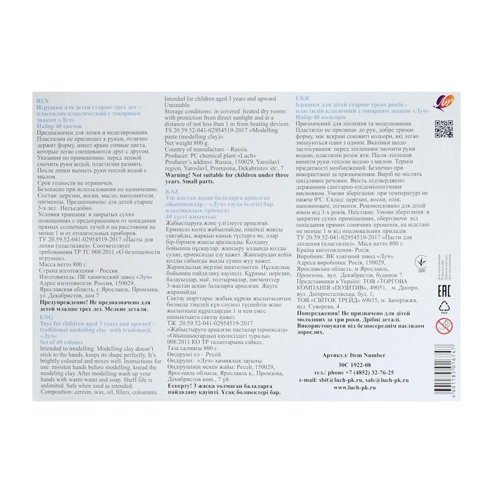 Пластилин 40 цветов 800 г "Классика"