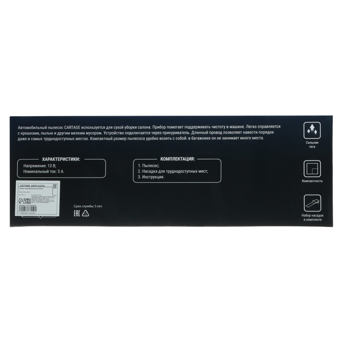 Пылесос автомобильный CARTAGE, 5 насадок, 140 Вт, 12 В, черный