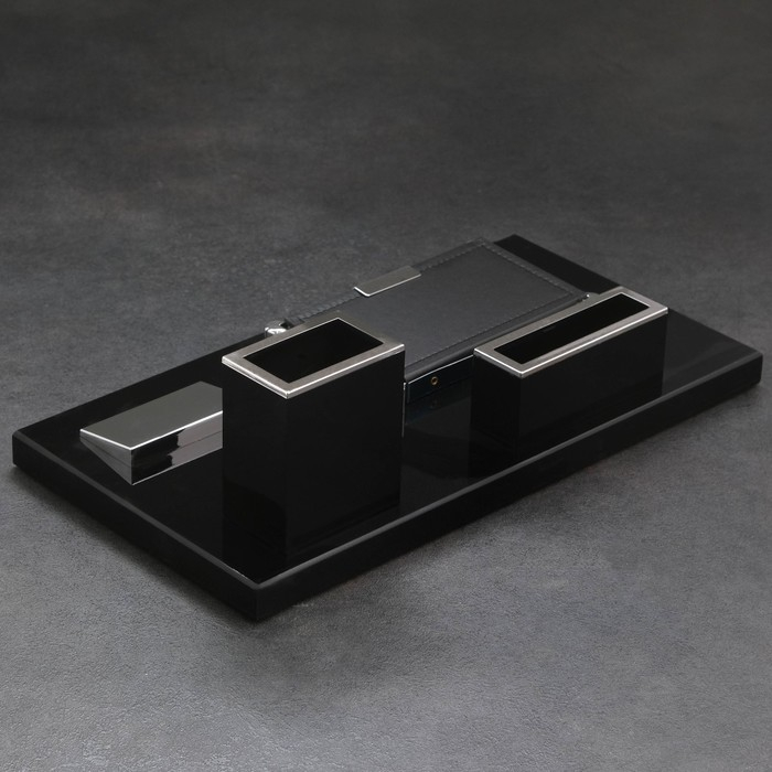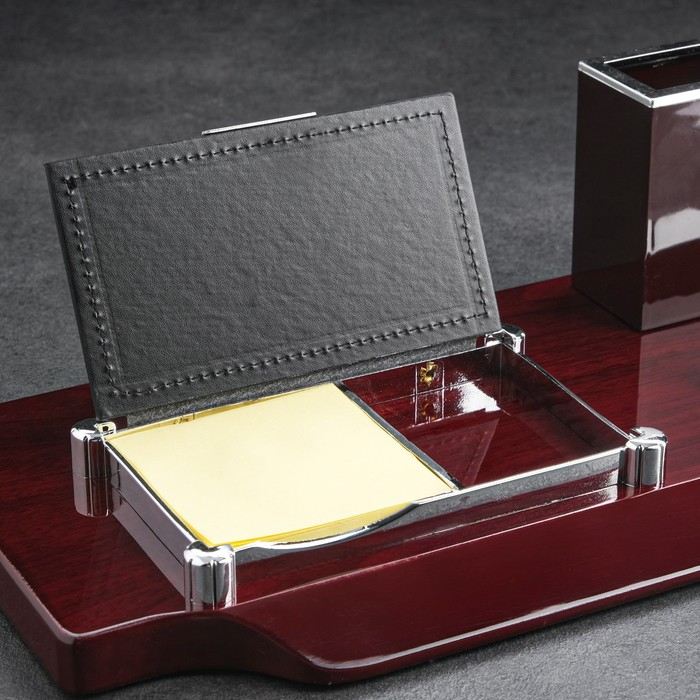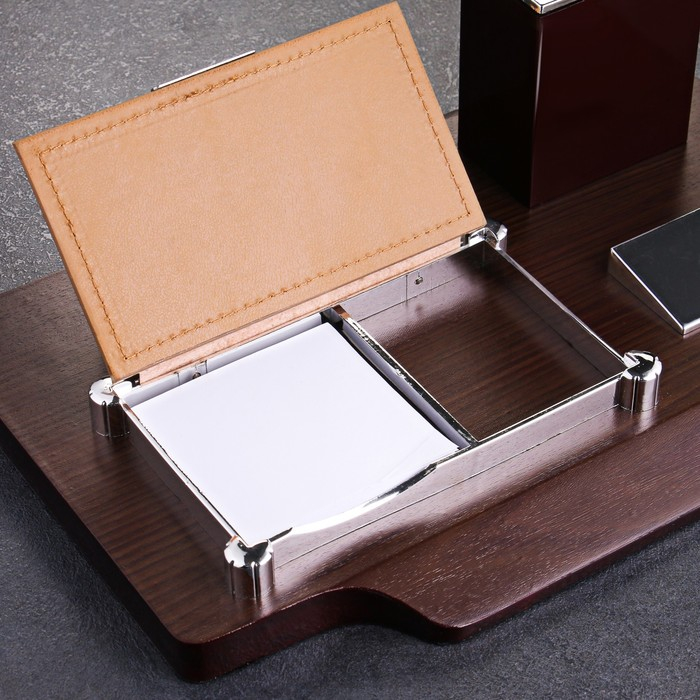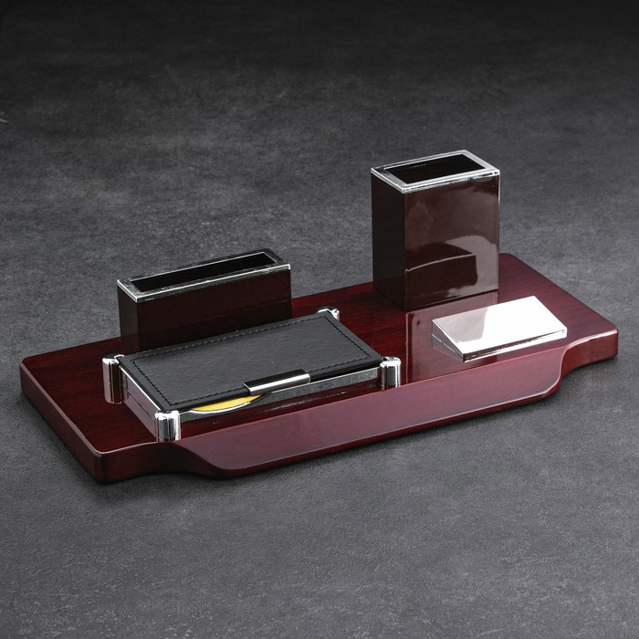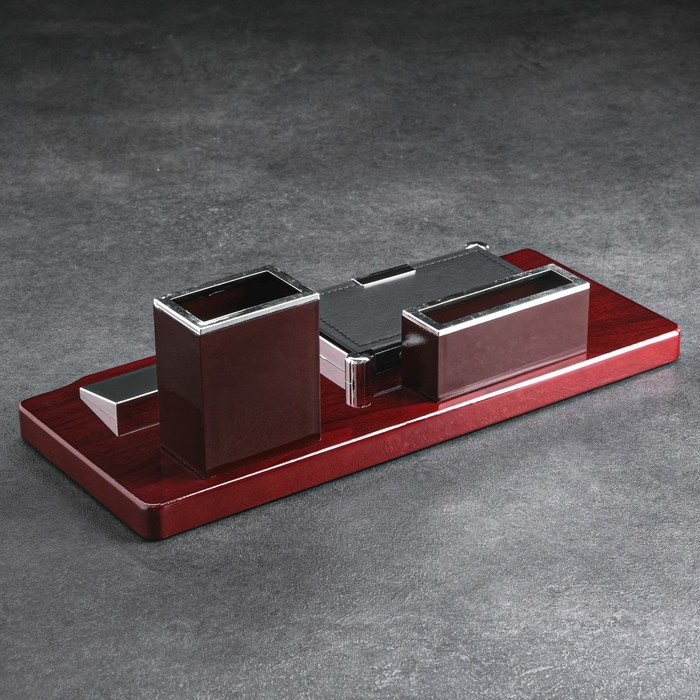 Компактный настольный набор поможет избежать хаоса на рабочем месте. Храните в нём канцелярские принадлежности или другие мелочи, чтобы правильно организовать пространство. К тому же изделие имеет минималистичный дизайн и выполнено под дерево, поэтому оно украсит собой любое место как декоративный элемент.