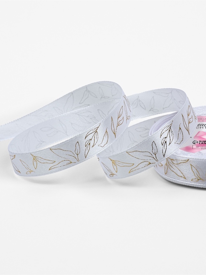 Лента атласная 15мм*25±1ярд(23м±1м) листья белый №01 тиснение золото АУ