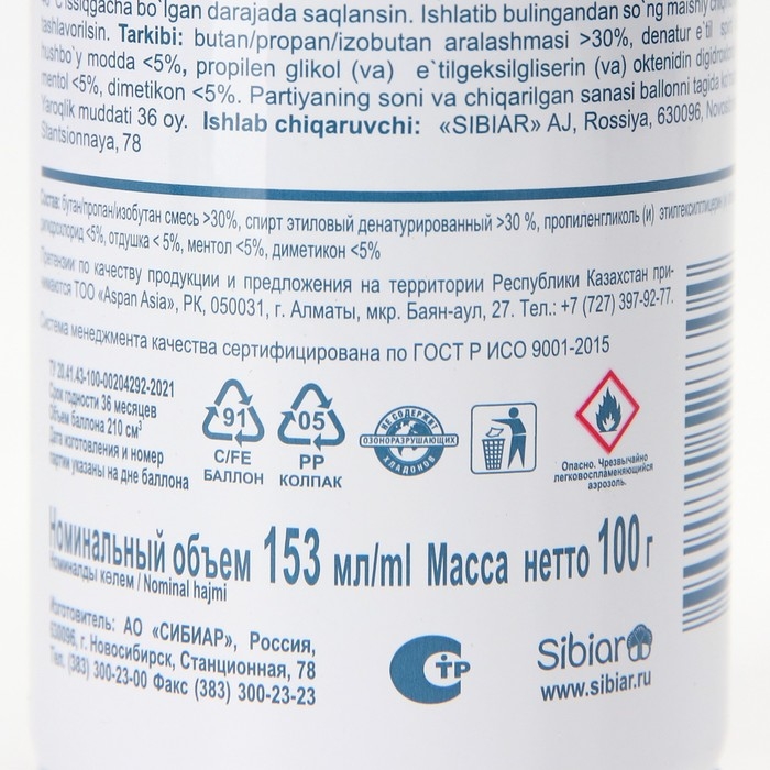 Состав: бутан/ пропан/изобутан смесь >30%, этанол >30 %, пропиленгликоль (и) этилгексилглицерин (и) октенидина дигидрохлорид<5%, отдушка < 5%, ментол <5%, диметикон<5%.
