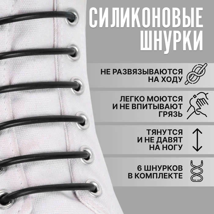 Набор шнурков для обуви, 6 шт, силиконовые, круглые, d = 3 мм, 6,5 см, цвет чёрный