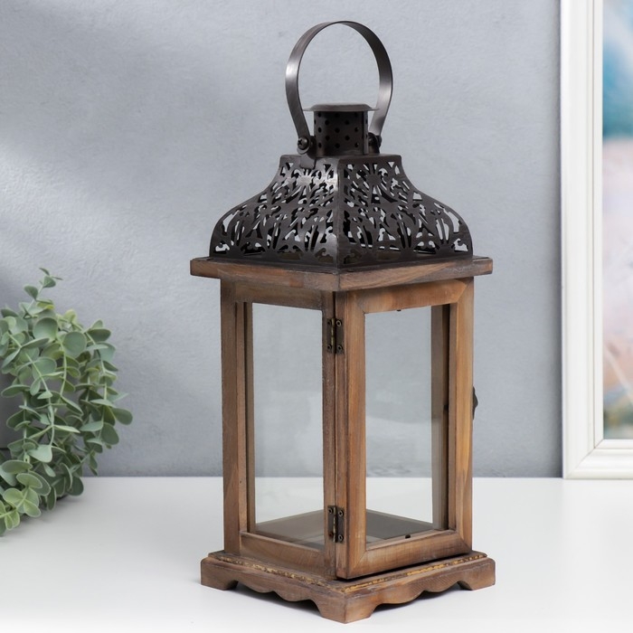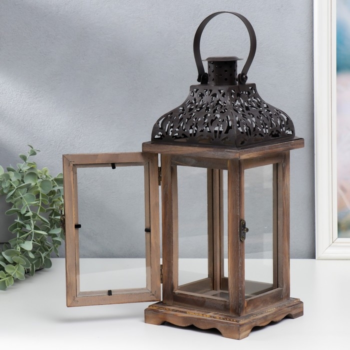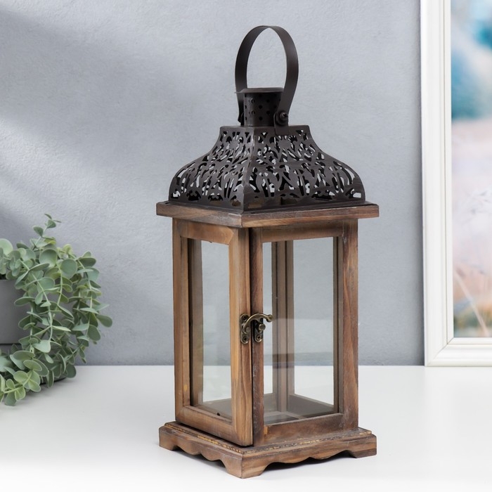 Подсвечник дерево на 1 свечу "Фонарь с резной крышей" темно-коричневый 33х14,5х14,5 см