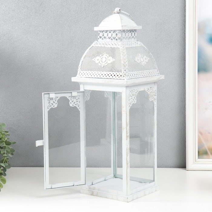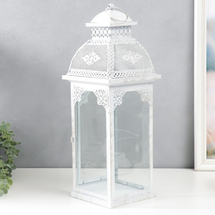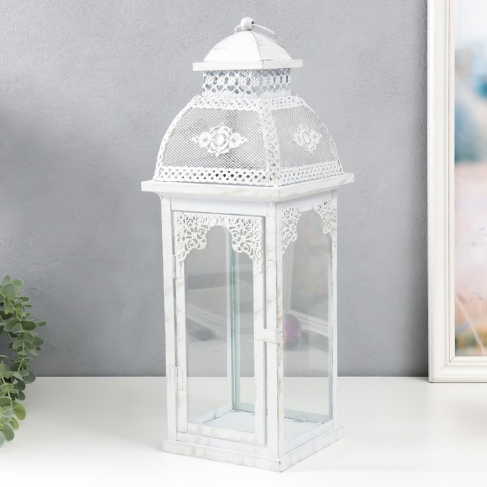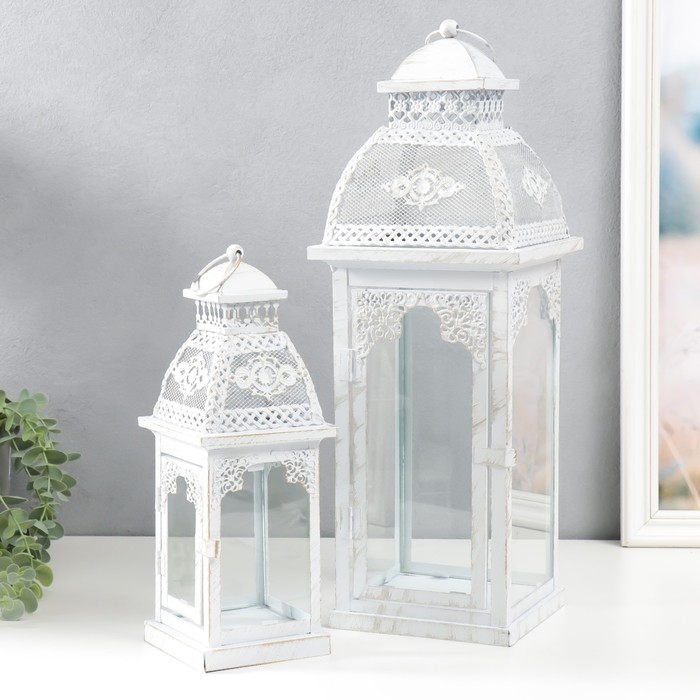 Подсвечник металл, стекло "Фонарь - ажурный узор" н-р 2 шт d-7,5, 12 см белый 15х15х46 см