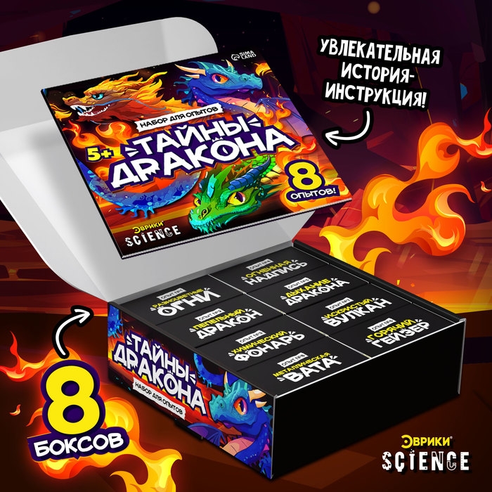 Набор для опытов «Тайны дракона» от торговой марки «Эврики» – это увлекательный способ для детей от 5 лет узнать о драконах и их истории. В наборе содержится 8 опытов, которые позволят детям самостоятельно провести научные эксперименты и узнать, как работает наука.