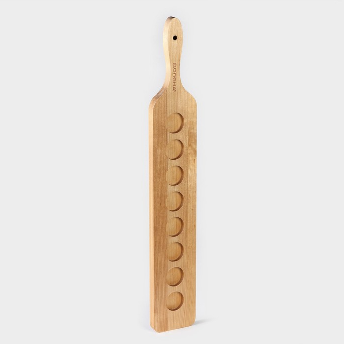 Доска для подачи шотов с ручкой, 60×9×1,8 см, на 8 рюмок, диаметр ячеек 3,9 см, с пропиткой, берёза