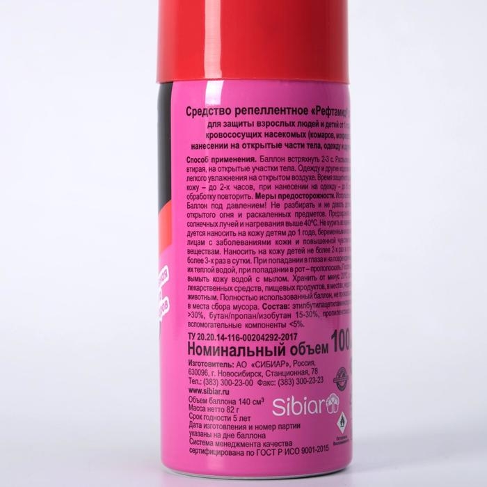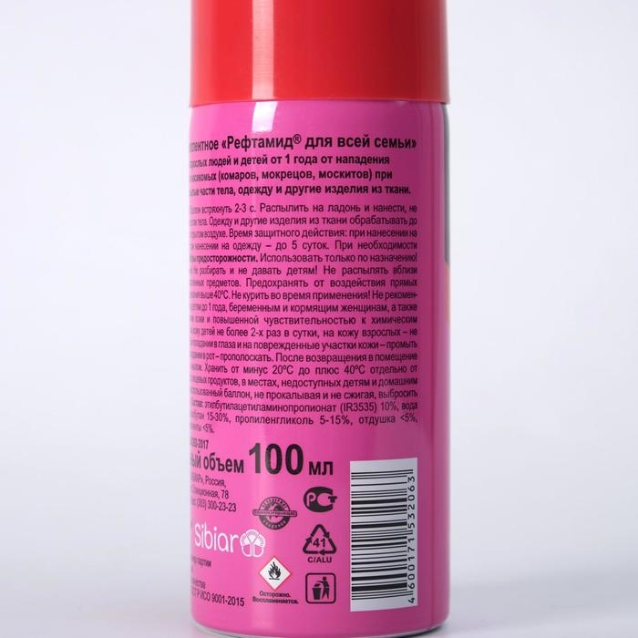 ОПИСАНИЕАэрозоль репеллент Рефтамид Baby, 100 мл На природе и дома многие люди сталкиваются с клещами, клопами, москитами и другими опасными насекомыми, которые способны причинить массу вреда. Они переносят инфекцию, пьют вашу кровь и просто раздражают своим внешним видом.; Средство репеллент от торговой марки «Рефтамид» применяется для защиты детей от укусов кровососущих насекомых (комаров, мокрецов, москитов). Состав препарата разработан с учётом особенностей чувствительной кожи ребёнка. Детям с трёхлетнего возраста средство наносится на одежду, с пятилетнего возраста — на открытые части тела.; Аэрозоль сохраняет своё действие в течение 2 часов.; Храните средство в недоступном для детей месте. Предохраняйте от попадания препарата на пластик.; Состав: альфациперметрин 0,2%, N,N-диэтилтолуамид (ДЭТА) 7,0%, спирт этиловый денатурированный 49,6%, вспомогательные компоненты, отдушка, углеводородный пропеллент. Срок годности: 5 лет.