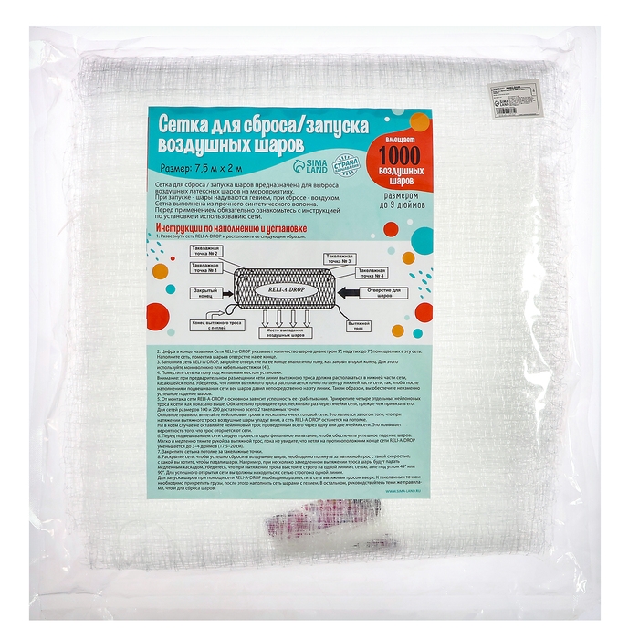 Сетка для сброса / запуска шаров предназначена для выброса воздушных латексных шариков на больших мероприятиях. При запуске шары надуваются гелием, при сбросе — воздухом. Изделие выполнено из прочного синтетического волокна.
