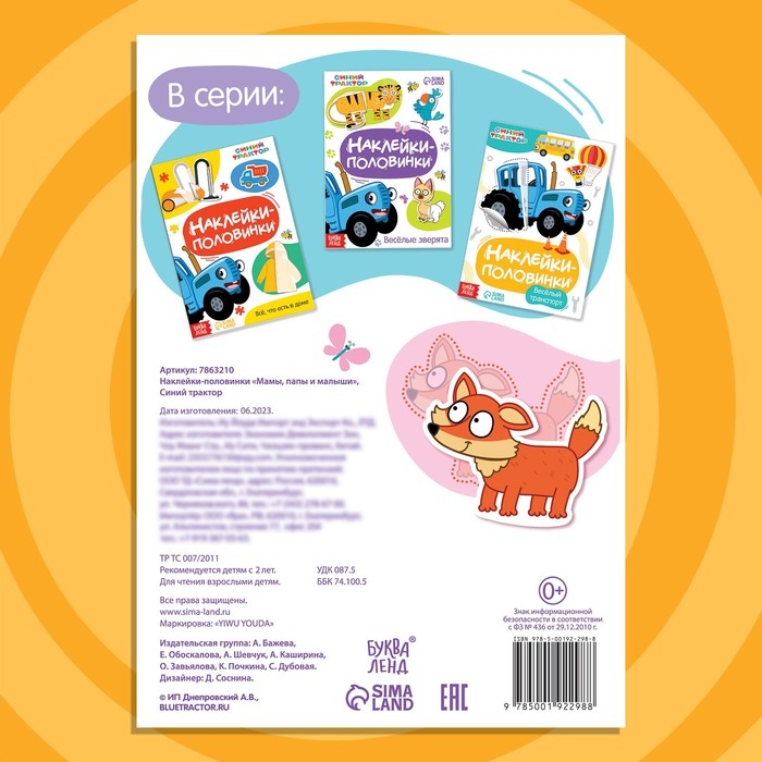 Книжка «Наклейки - половинки. Мамы, папы и малыши», 16 стикеров, Синий трактор