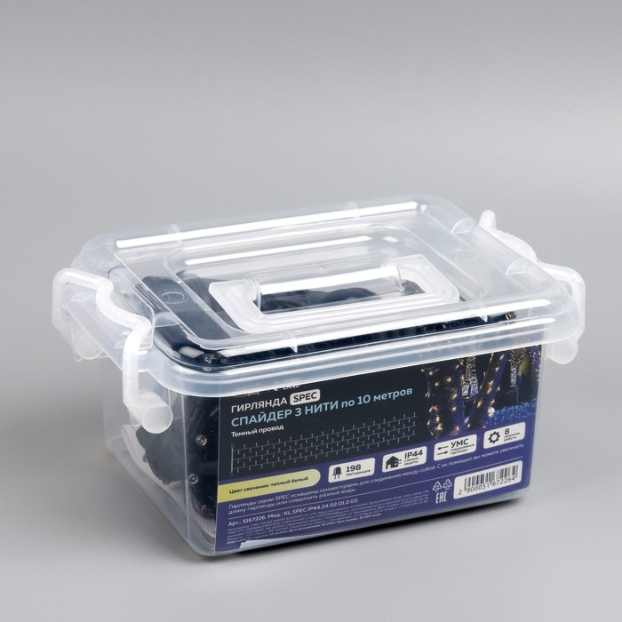 Гирлянда «Клип-лайт» 3 нити по 10 м, IP44, УМС, тёмная нить, 198 LED, свечение тёплое белое, 8 режимов, 24 В