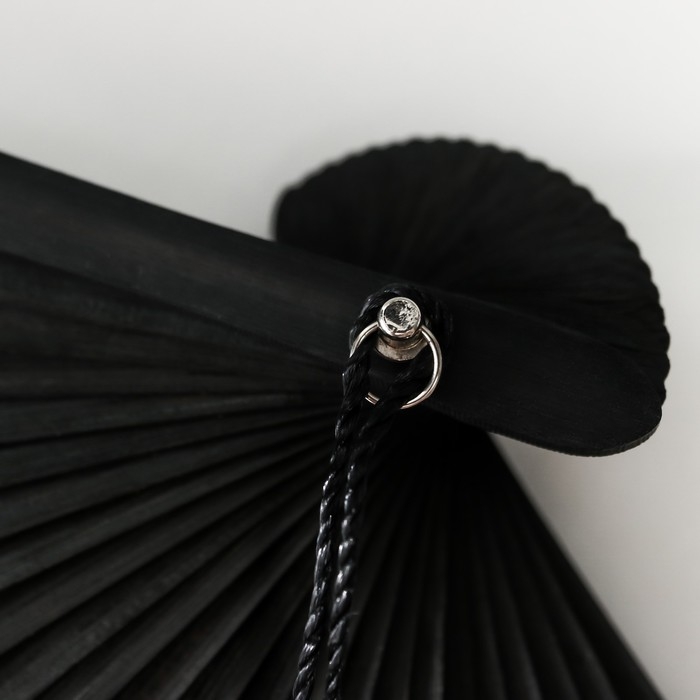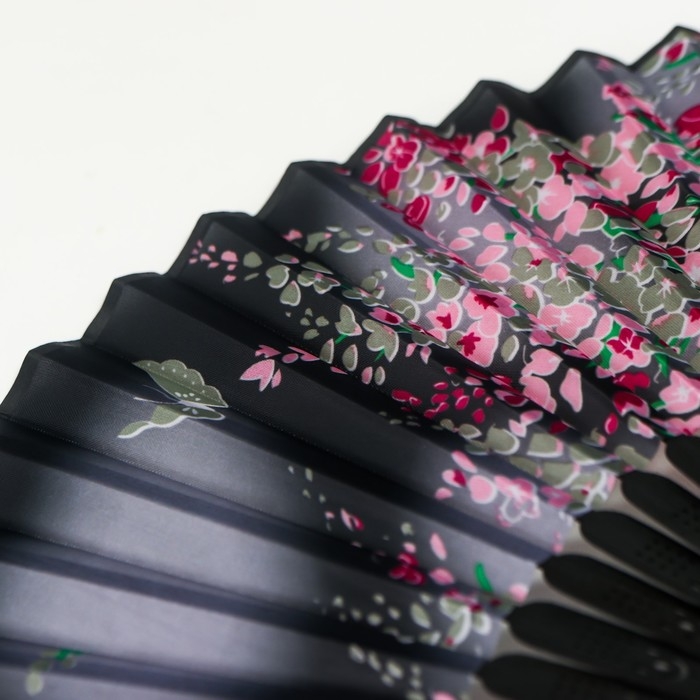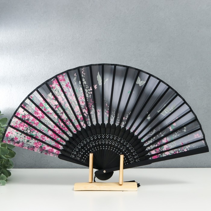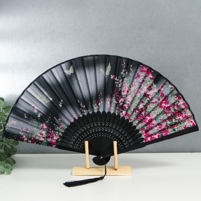 Веер бамбук, текстиль h=21 см "Цветы и бабочки" чёрный, с кисточкой