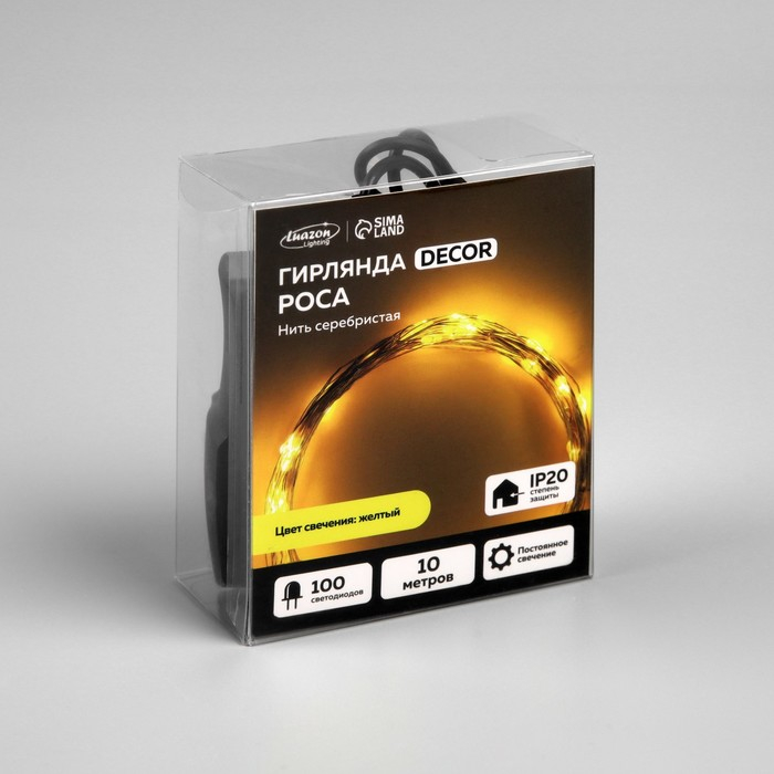 Гирлянда «Нить» 10 м роса, IP20, серебристая нить, 100 LED, свечение жёлтое, 12 В