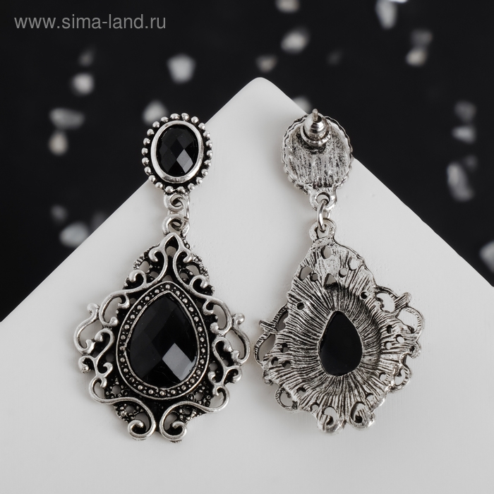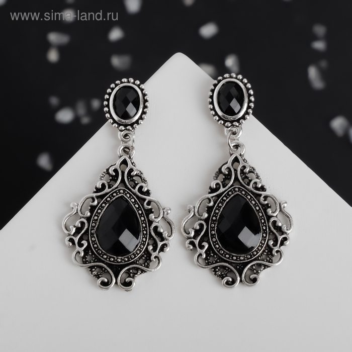 Серьги со стразами «Изящность» ажурная, цвет чёрный в чернёном серебре