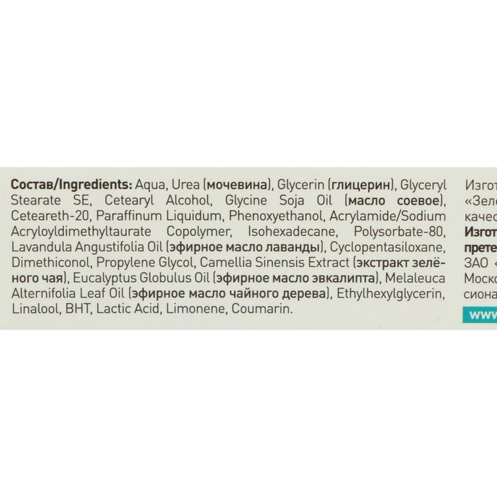 Состав: Aqua, Urea (мочевина), Glycerin (глицерин), Glyceryl Stearate SE, Cetearyl Alcohol, Glycine Soja Oil (масло соевое), Ceteareth-20, Paraffinum Liquidum, Phenoxyethanol, Acrylamide/Sodium Acryloyldimethyltaurate Copolymer, Isohexadecane, Polysorbate-80, Lavandula Angustifolia Oil (эфирное масло лаванды), Cyclopentasiloxane, Dimethiconol, Propylene Glycol, Camellia Sinensis Extract (экстракт листьев зеленого чая), Eucalyptus Globulus Oil (эфирное масло эвкалипта), Melaleuca Alternifolia Leaf Oil (эфирное масло чайного дерева), Ethylhexylglycerin, Linalool, BHT, Lactic Acid, Limonene, Coumarin.