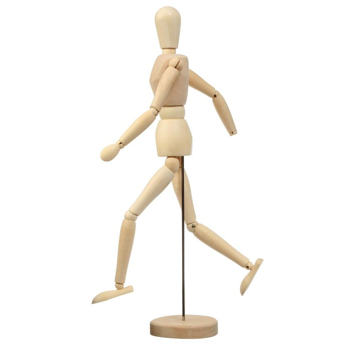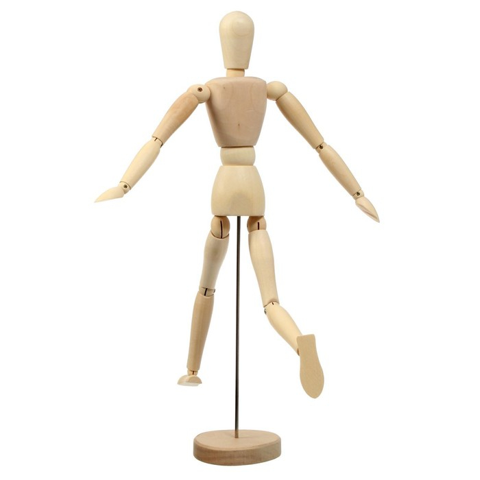 Деревянный маникен человеческой фигуры с подвижными руками, ногами, а также головой. Применяется художниками, скульпторами, модельерами для имитации разнообразных человеческих поз. Все детали маникена выточены из дерева под определенную часть человеческого тела и скреплены в местах сгиба суставов металлическими болтиками и пружинками, благодаря чему то или иное действие передается более точно, за счет чего удобно зафиксировать маникен в нужном положении. Создается основа рисунка, для того, чтобы в дальнейшем проработать картину во всех подробностях. Деревянная модель отлично подойдёт скульпторам, модельерам или художникам для работы, что бы изучать анатомию движения конечностей.