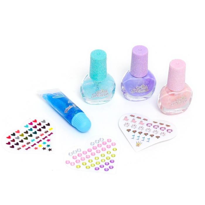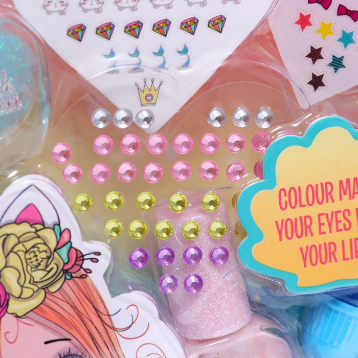 Этот набор идеально подходит для того, чтобы девочки могли не только заниматься макияжем, но и творчески оформлять свои ногти с использованием разнообразных декоративных элементов. Такие продукты обычно легко смываются водой или ватным диском и безопасны для детской кожи.