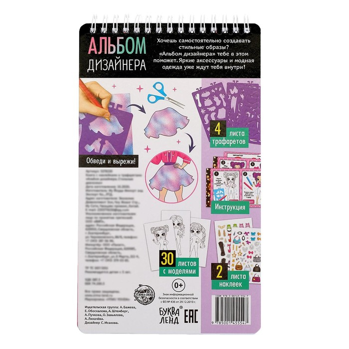 Малышка сможет самостоятельно создавать стильные образы, в этом ей поможет «Альбом дизайнера». Ребёнку нужно вырезать яркие аксессуары и модную одежду, а затем нарядить куколок.