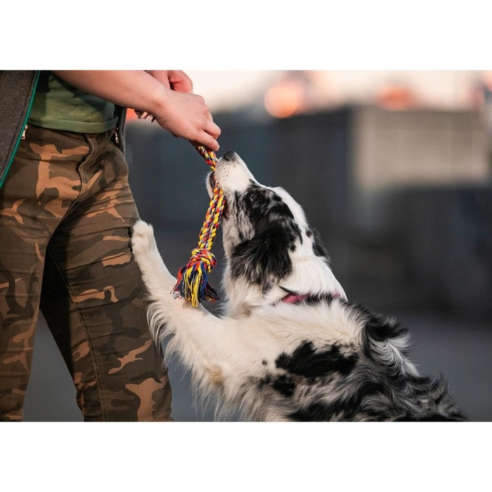 Одна из самых популярных игрушек для собак всех пород. Изготовлена из 100% хлопка. Такая игрушка не только увлекательна, но и полезна для здоровья животного - во время игры хорошо очищает десны и зубы от налета.