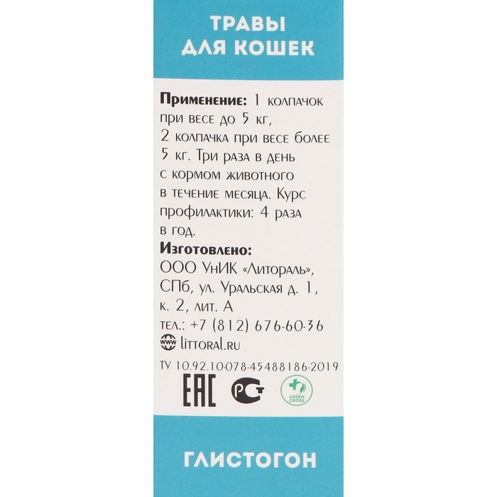 Состав: экстракты грецкого ореха молочно-восковой спелости, семян тыквы, полыни, гвоздики, чеснока, пижмы. Глистогонный препарат для кошек «Глистогон» — это композиция из 6-ти лекарственных трав, каждая из которых традиционно считается сильнейшим природным средством от глистов. Важно помнить, что паразиты от любимого питомца могут перейти и к человеку, поэтому крайне важно заниматься не только лечением, но и профилактикой появления глистов. Если у вас дома несколько животных, глистогонный препарат для кошек следует давать всем им одновременно. Благодаря входящим в состав травам «Глистогон» не только изгоняет паразитов и исключает интоксикацию организма, но и способствует регенерации повреждённых тканей.Грецкий орех молочно-восковой спелости обладает противоглистными, бактерицидными и слабительными свойствами. Одним из активных компонентов, содержащимся в грецком орехе, является юглон. Он подавляет активность ферментов, отвечающих за активацию клеток, тем самым не давая проникнуть в клетку токсинам. Поэтому при повреждении паразита отсутствует токсический эффект. Пижма. Присутствие в пижме туйона оказывает расслабляющее действие на мускулатуру аскарид и остриц, способствуя их откреплению и выведению из организма. Входящие в состав пижмы флавоноиды способствуют регенерации слизистых оболочек и тканей.Полынь улучшает пищеварение, оказывает антигельминтное, желчегонное и мягкое слабительное действие. Используют в качестве противоглистного средства при кишечных паразитах. Гвоздика оказывает противоглистное, противомикробное действие. Чеснок является эффективным средством от кишечных паразитов (глистов) и инфекционных болезней. Тыква — антигельминтное средство. Наиболее эффективно в отношении различных ленточных глистов, солитёра. Кроме того, оказывает желчегонное и слабительное действие, что также способствует выведению паразитов из кишечника. Показания к применению: профилактическое и глистогонное средство при заражении ленточными и круглыми гельминтами. Способствует восстановлению слизистых тканей после глистных инвазий. Способ применения и дозы: принимать 2 раза в день с кормом в течение месяца: 1 колпачок при весе до 5 кг; 2 колпачка при весе более 5 кг; 1 колпачок — 5 мл. Курс профилактики — 4 раза в год. Условия хранения: хранить в прохладном месте. Срок годности 2 года.
