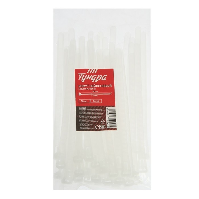 Хомут нейлоновый для стяжки, ТУНДРА, многоразовая, 7,2х150 мм, белый, 50 шт