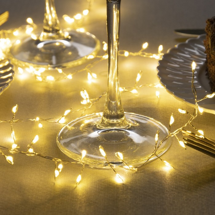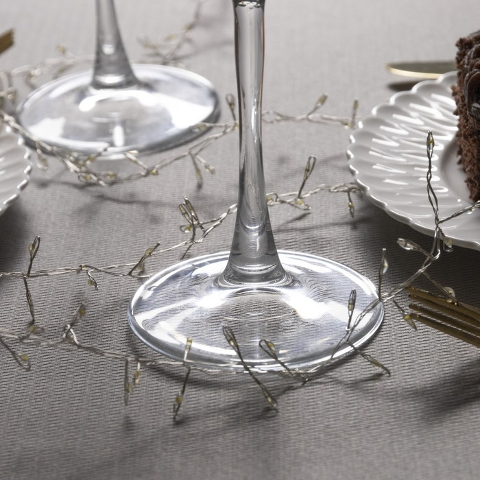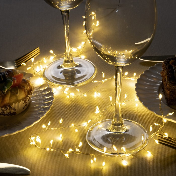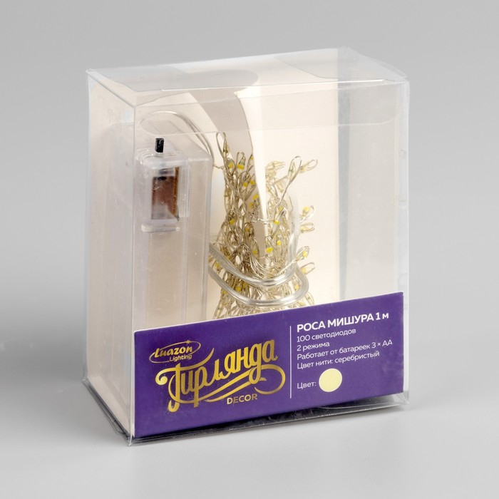 Гирлянда «Мишура» 1 м роса, IP20, серебристая нить, 100 LED, 2 режима, батарейки AAх3 (нет в комплекте), свечение тёплое белое