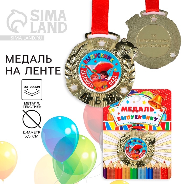 Медаль детская на Выпускной «Выпускник детского сада», на ленте, золото, металл, d = 5,5 см