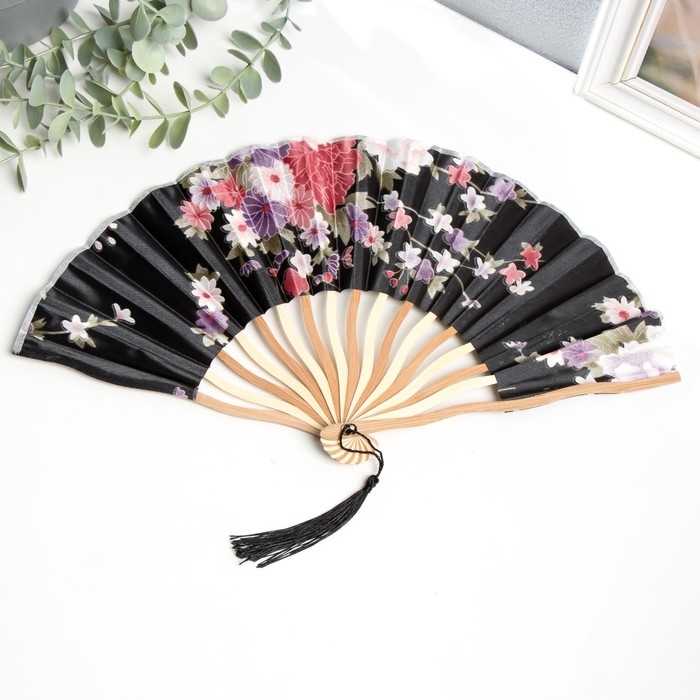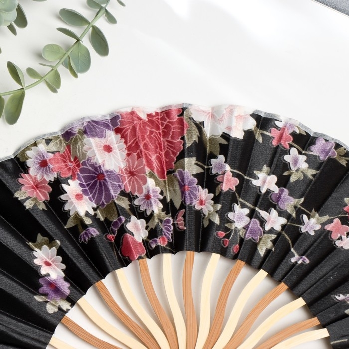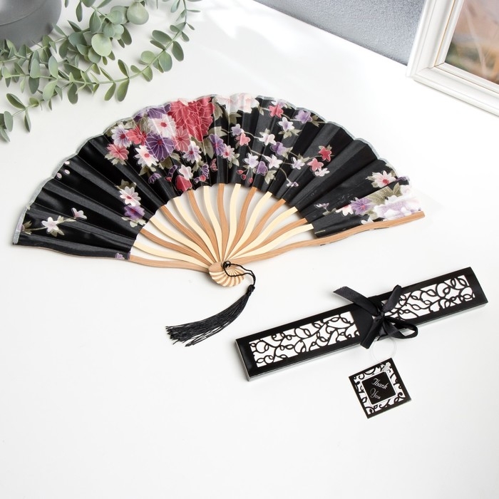 Веер бамбук, текстиль h=21 см изгиб, с кистью "Цветы" в коробке, чёрный